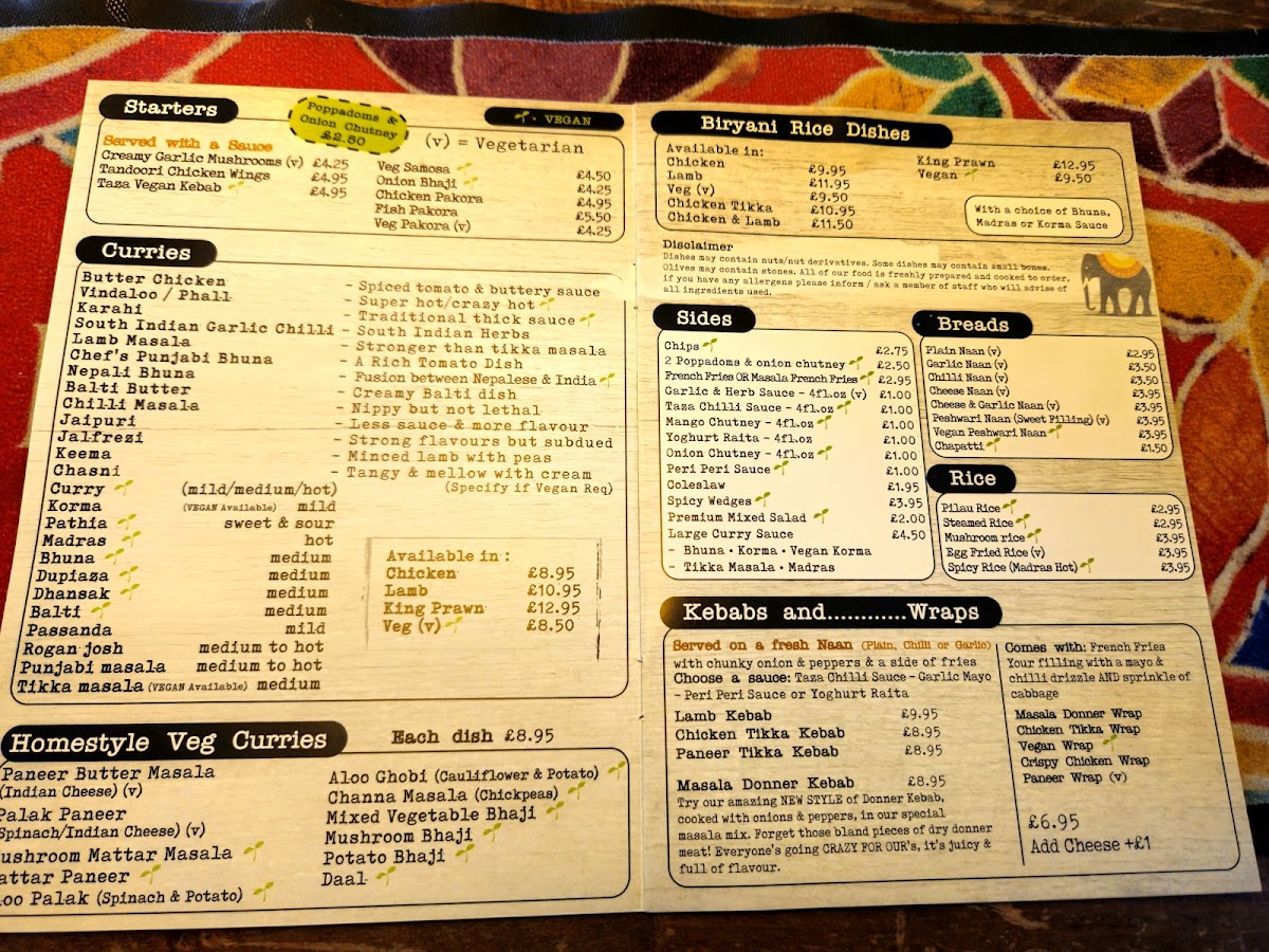Vegan. Choose 1 starter - includes taza chilli sauce, Taza vegan kebab - lahori kebab - onion bhaji Any 1 curry from the old favourites or traditional vegetable dishes section (excludes tikka masala) - Any 1 of the following: steamed rice - pilau rice, chips, plain naan, garlic or chilli naan 50p, filled naan 1.00.